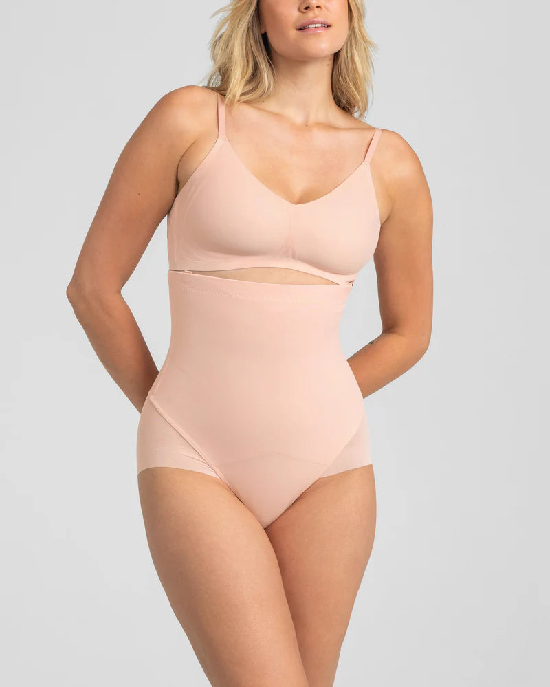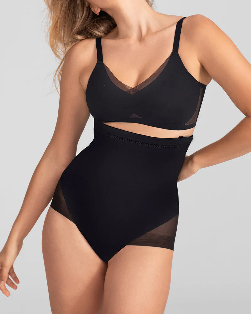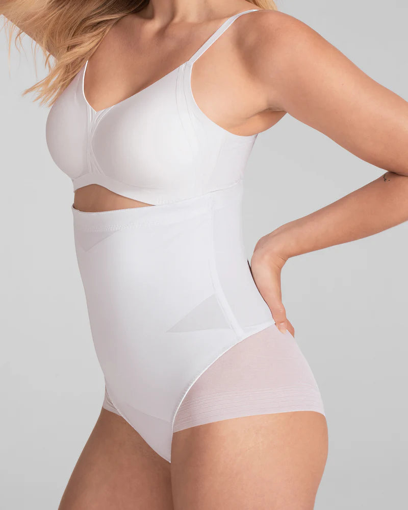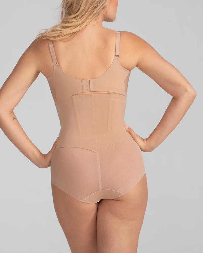 This sleek shaping brief sculpts the midsection using Honeylove’s signature targeted X compression. Built-in side boning defines your waist and keeps the garment in place. A mesh brief bottom smooths your booty without creating panty lines thanks to a flat, engineered finish.